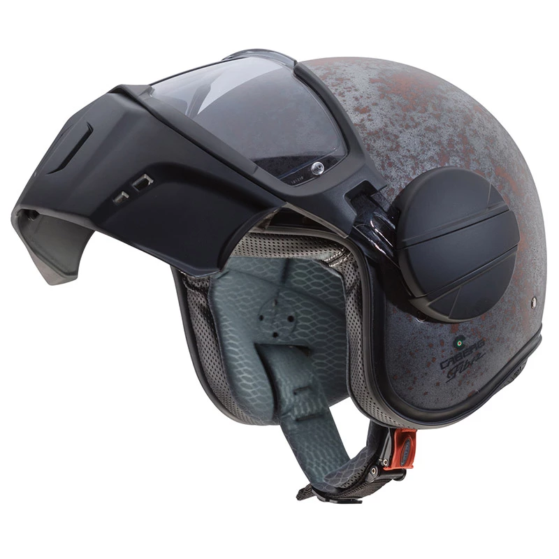 The aggressive look and shapes are combined with great functionality, that is unique on the market. This Jet, in fact, is equipped not only with a particular goggle shape visor that adheres to the face thanks to the foam profile along the inner lower side of the visor, but also with a mask easy to use to protect the face from the cold in the winter months and from swallowing too many gnats in the summer timeβ¦
