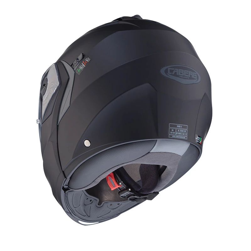 The DUKE X is the result of the acquired experience of Caberg that was the first Italian company to produce flip up helmets. DUKE X comes with the dual homologation P/J which allows you to ride with the chin guard open guaranteeing safety thanks to the lever P/J on the left-hand side of the helmet. This lever, when in the โJโ position, blocks the chin-guard in the fully open position avoiding the chin guard to accidentally close. Thanks to the reduced dimensions of the helmet, the weight of the DUKE X is only 1550 gr +/