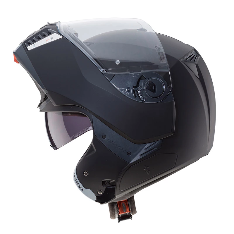 Caberg modular helmets Sintesi comes from more than thirty yearsβ experience of Caberg, the fi rst Italian company to produce a fl ip up helmet, in designing fl ip up helmets with revolutionary functional characteristics. Sintesi is equipped with an innovative mono button chin guard opening system, which, thanks to a rototraslation movement, allows, in opening position, to have the chin guard much closer to the shell compared to traditional fl ip up helmets. This feature reduces the head wind effect and prevents from accidental closing of the chin guard. Moreover, thanks to this particular chin guard movement, Sintesi has been homologated with a dual homologation: full face and jet, that consents the motorcyclists to ride both with the chin guard closed, guaranteeing the safety of a full face helmet, and with the chin guard open in jet confi guration. In order to hold down weights, prorate the helmet volume to the motorcyclistβs size, and avoid the problem of diffi cult fi tting of the chin guard for bigger sizes, Sintesi has been designed with a double size body; this means that there are not only two shell sizes, but also two chin guard sizes and visors: small size from XS to L, while the big size from XL to XXXL. As for Caberg tradition, also Sintesi is equipped with the exclusive Double Visor Tech system that, thanks to an inner sunvisor, easy to use, allows always to ride with the perfect light and maximum safety. The inner sun visor is treated antiscratch, while the clear one is antiscratch with Pin Lock antifog. Ventilation is guaranteed by two vents easy to move, one positioned on the chin guard to air directly the inner surface of the visor avoiding misting, and the other one on top the shell to allow a perfect ventilation inside the helmet. Sintesi is also equipped of two air extractors on the back to ease the discharge of hot and stale air. The lining is completely removable and washable, realized with hypoallergenic and transpiring fabrics. The different cheek pads densities allow an excellent comfort for every size. Cheek pads have been equipped with glasses seating to facilitate the accommodation of spectacles. Sintesi is preset for Caberg JUST SPEAK wireless communication system, which allows to communicate not only with your own cell phone and your passenger, but also to connect to a GPS system, listen to music trough a MP3 player or simply to an integrated radio system. JUST SPEAK is equipped with Bluetooth profi le A2DP that allows high quality audio stereo. Outer sheel: Thermoplastic material with high resistance to crash impacts, two external bodies (2 shells, 2 chin guards, 2 visor mechanisms) Lining: Completely removable and washable lining with hypoallergenic and traspirant fabrics treated sanitized Visors: Double Visor Tech