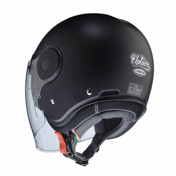 UPTOWN is the new jet from Caberg with a classic and elegant look conceived for the touring world and very useful for everyday urban routes. Uptown has been realized in two shell sizes in polycarbonate, in order to offer the best fitting proportion between the shell volume and the motorcyclistβ head. The two frontal air vents as well as the air extractors on the back guarantee a perfect ventilation also during the hottest times. The exclusive system Double Visor Tech, thanks to the easy to use inner sun-visor, allows to ride always with the right light and in safety. The outer transparent visor, anti-scratch treated and prepared to fit the Pinlock lens, has a wide dimension to grant high air protection also during longer distance routes. In order to prevent the visor from brushing against the shells, it is better to use the lateral ratchets on the shell. The retention system has a micrometric buckle for safe and easy adjustments. Uptown is also equipped with a ring to secure the helmet to the motorbike. The lining is completely removable and washable, realized with high transpiring fabrics. Uptown is preset for the CABERG JUST SPEAK S wireless communication system, which allows through Bluetooth technology to communicate not only with your cell phone and your passenger, but also to connect to a GPS system, listen to the music through a mp3 player or mobile phone. Just Speak S uses the Bluetooth A2DP profile. Uptown is available the solid colors matt black and white; the graphic versions are: LEGEND in different colors combination; ITALIA with the Italian fl ag colors; GEAR with matt black base and white graphic; and LADY dedicated to women.